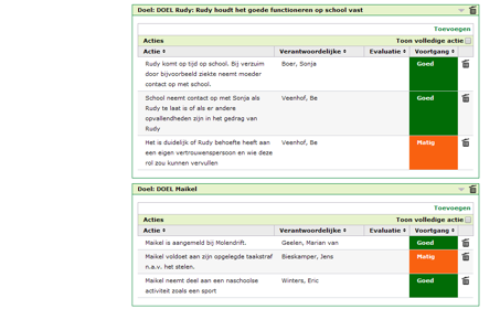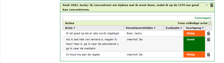 Met school en thuis, met het hele gezin worden er nog meer gedetailleerde afspraken gemaakt en binnen Samen1Plan opgeschreven. De tijd van opstaan en naar bed gaan, bijvoorbeeld. Aan moeder laten weten waar zij is, als zij buitenshuis gaat. Haar broer en broertje niet uitdagen of jennen, maar samen de afwas doen, om de dag. Al die afspraken worden uitgeprint en op de koelkast gehangen. Zo is het een houvast voor iedereen. Jacky staat er op dat zij zelf binnen Samen1Plan de voortgang kan aangeven. Rood, oranje of groen. Het versterkt haar drang naar autonomie en gevoel voor eigenwaarde. Als het niet goed gaat, wil zij er graag eerst met Marieke over praten, dan pas met anderen. Iedereen gaat akkoord. Marieke en mentor houden contact over Jacky’s vorderingen op school.